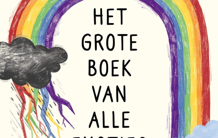 Het grote boek van alle emoties is echt een groot boek met een stevige kaft. Op de voorkant een mooie regenboog met links een donderwolk en rechts een veel lichter wolkje.