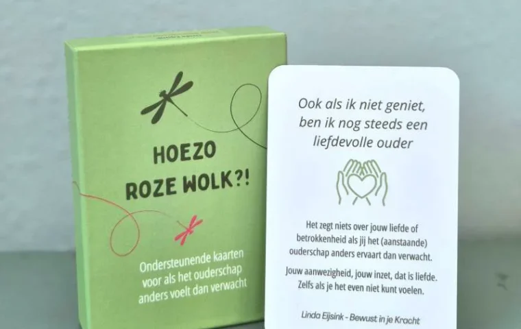 Zij maakte een prachtig kaartendeck ‘Hoezo een roze wolk?!”. In een vijftal thema’s stelt zij belangrijke vragen en deelt ervaringen: